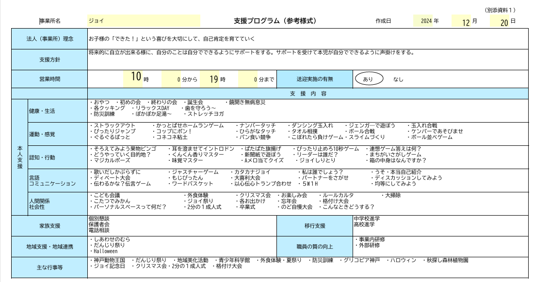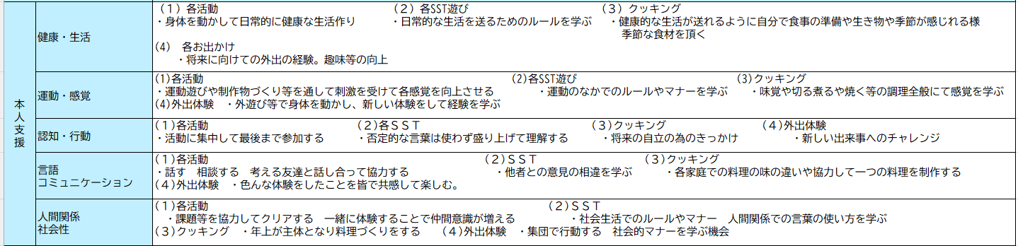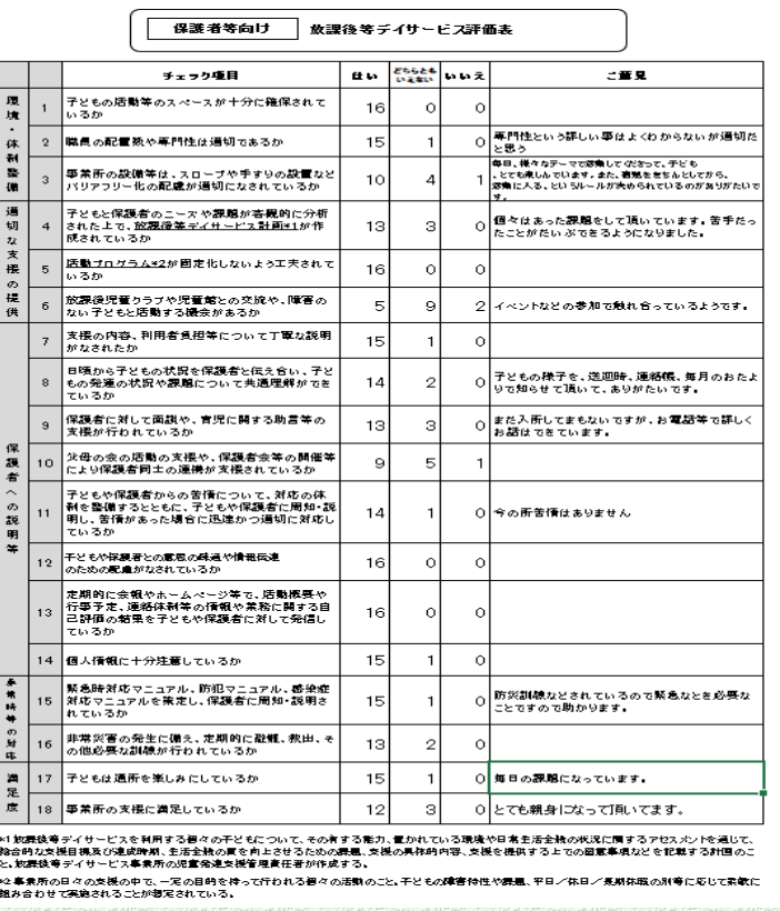 | 5 | 保護者等向け評価表を活用する等によりアンケート調査を実施して保護者等の意向等を把握し、業務改善につなげているか | ○ | アンケートを基に保護者のニーズを把握して、 業務改善につなげている。 |